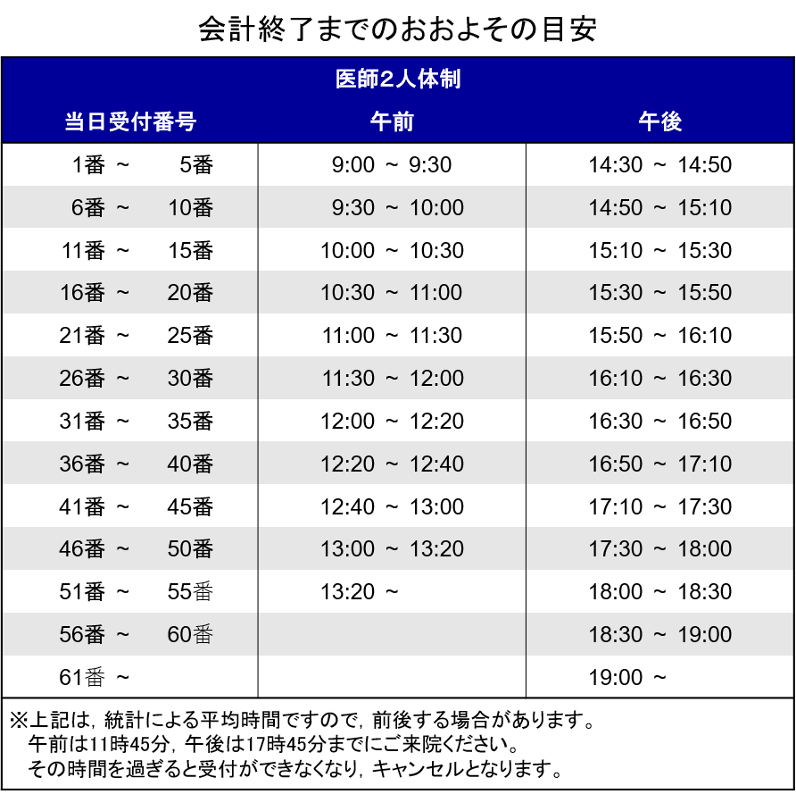 例:9番の方は「来院お知らせメール」が来てから来院→現病歴確認(初診・再初診のみ)→診察→会計終了10時頃